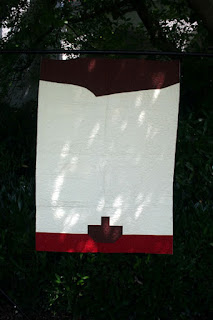 This little quilt is inspired by one of Dan of the Bay Area Modern Quilt Guild. A friend of mine found recordings made by the Voyager Space Craft as it passed by the planets. It's not just static, there's chords, sustained tones, pops, booms, cool rhythms and unexpected changes. I quilted vibrating lines between the planet's paths on this quilt. One day I'll figure out what colour to bind it in and will get it finished. One day...The blue planets are made of squares from my box of left-overs from other quilts. The big circle was too big for the front, so I put half on front and half on the back. I inset the blue circles into the orange circles, then inset those into the background. I still haven't decided how to quilt the blue areas.
